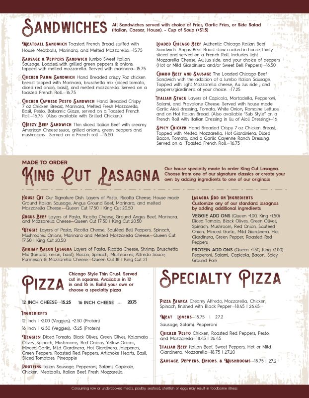 This locally owned and operated restaurant specializes in some of the great Italian classics as well as some of the not so classic. Home of the King Cut Lasagna and Loaded Chicago Beef.